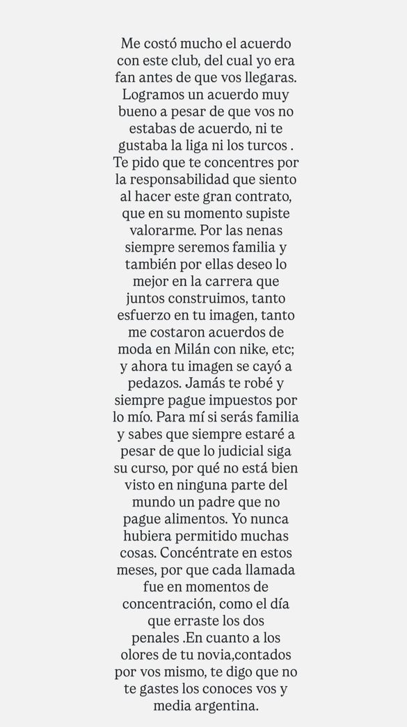 Wanda Nara, sözlerini şöyle tamamladı; "Benim için her zaman aile olacaksın ve hukuki süreç devam etse de her zaman yanında olacağımı biliyorsun. Çünkü dünyada nafaka ödemeyen bir baba iyi karşılanmaz. Birçok şeye asla izin vermezdim. Bu aylarda odaklan. Çünkü her arama konsantrasyon anlarında oldu. İki penaltıyı kaçırdığın gün gibi. Kız arkadaşının kokularına gelince; senin kendin anlattığın gibi, boşuna zaman harcama. Sen ve Arjantin'in yarısı tanıyor.