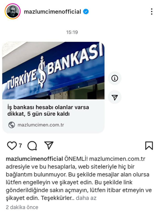 Sosyal medya hesabından açıklama yapan sanatçı; "Önemli! mazlumcimen.com.tr adresiyle ve bu hesaplarla, web siteleriyle hiçbir bağlantım bulunmuyor. Bu şekilde mesajlar alan olursa lütfen engelleyin ve şikâyet edin. Bu şekilde link gönderildiğinde sakın açmayın, lütfen itibar etmeyin ve şikâyet edin. Teşekkürler" dedi.