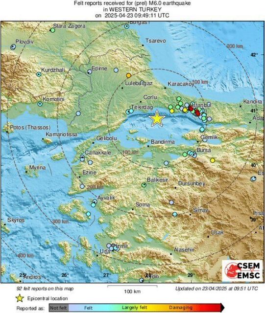 İstanbul'da saat 12.49'da 6,2 büyüklüğünde deprem meydana geldi. İstanbul'un yanı sıra çevre illerde de hissedilen depremin yerin 6,92 kilometre derinliğinde meydana geldiği belirlendi.Saat 15.12'ye kadar en büyüğü 5.9 olan 51 artçı deprem kaydedildi