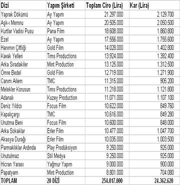 Forbes'un bu ayki sayısında yer alan analize göre Yaprak Dökümü'nün cirosu 21.3 milyon TL olurken onu final bölümüyle büyük ses getiren Aşk-ı Memnu izledi. Aşk-ı Memnu'nun cirosu 20.5 milyon TL'yi buldu. Yaprak Dökümü 2.13 milyon TL kâr getirdi. Buna karşılık Aşk-ı Memnu'nun getirdiği kâr, 2.05 milyon TL oldu.