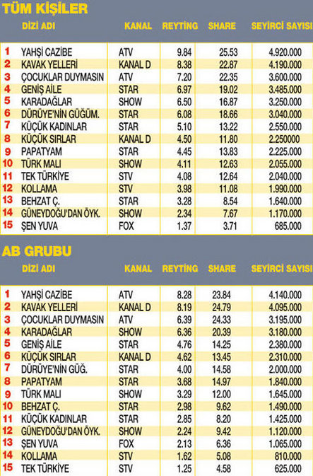 Geçen pazartesi günü, haftalık reyting çizelgesiyle birlikte dizilerin seyirci sayılarını da ortaya koyan bir yazı yazmıştım. Dizilerin hayatımızın üzerindeki etkisini, müthiş seyirci kitlesini rakamsal verilerle gözlerinizin önüne sermekti amacım. Bu hesabı, 50 milyonluk toplam seyirci pastası üzerinden, izlenme paylarına göre yapmıştım. Gördüm ki, reytingler kadar bir diziyi kaç kişinin izlediğini de merak ediyorsunuz. Bu talebi dile getiren telefonlar açıyor, e-mail’ler, mektuplar gönderiyorsunuz. İşte bu yüzden, bu pazartesinden itibaren reyting karnesine, dizilerin yayınlandığı son bölümlerinin kaç kişi
