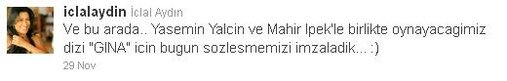 İclal Aydın'ın Atv'de yayınlanacak 'Göç Zamanı' adlı bir dramla ekranlara geleceği iddia edilmişti. Yasemin Yalçın gibi usta bir komedyenin yer alacağı 'Gına'nın bir komedi dizisi olması ihtimali yüksek.