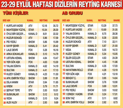 BİR Süleyman kolay yetişmiyor tabii... Bir Cemile çıkmıyor işte her zaman... Polat nice yiğit kahraman eskitti, hâlâ rakipsiz kendi yerinde. O kanal senin bu kanal benim her sene başka bir yerde dükkân açıyor, seyircisi de hep peşinde. Arka Sokaklar, Yalan Dünya, Kuzey Güney, Lale Devri, Pis Yedili aralarına yeni sezon dizilerini kolay kolay sokmayacak gibi görünüyor sezonun bu ilk ayında, ilk evresinde. Oysa çok umutluyduk eylül başında. Dila Hanım, Ustura Kemal, Veda, Son Yaz daha çok seyredilecek, daha çok sevilecek, eskilerin yerine yenileri gelecek diye bekledik bir hevesle. Yeni yıldızlarla evlerimiz, akşamları dizi keyiflerimiz renklenecek, şenlenecek dedik. Ama olmadı...