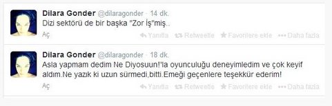 "Dizi sektörü de bir başka "Zor İş"miş.. Asla yapmam dedim Ne Diyosuun!'la oyunculuğu deneyimledim ve çok keyif aldım.Ne yazık ki uzun sürmedi, bitti. Emeği geçenlere teşekkür ederim!"