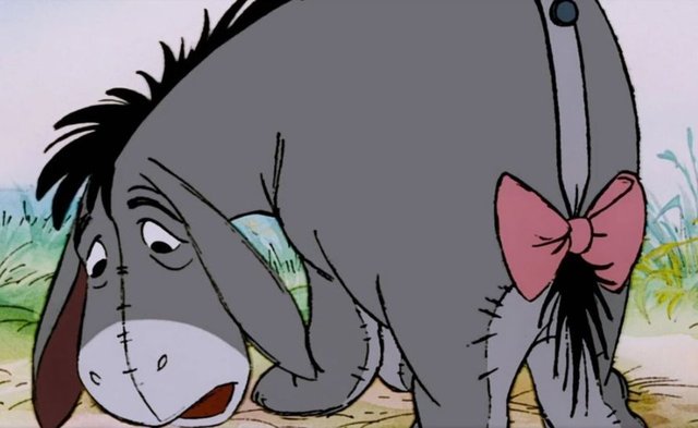 Eeyore karakterinin çizgi filmde sergilediği duruş ve ifade hep mutsuzdur. Üzgün tavrı her şeye karşı "Aman yapmayalım başımıza bir iş gelir" şeklinde söylemlerine yansır.