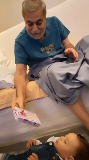 Kısa süre sonra dede olacak Mali, Parlak'ın bir yaşındaki kızını severek oyuncak hediye etti. Hızla verdiği kilolarla dikkat çeken Erbil'in, hastalık sürecindeki yorgunluğu da yüzüne yansıdı.