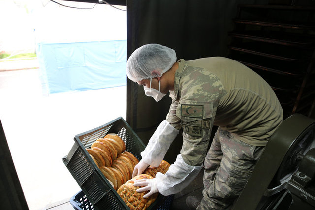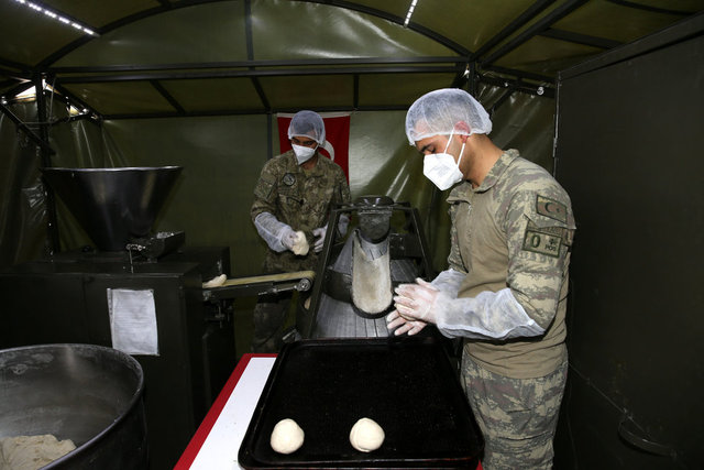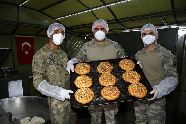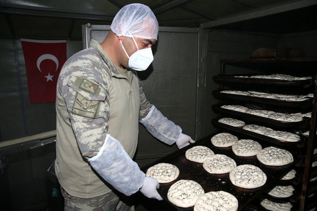 Mehmetçik, seyyar sahra fırınında günlük 1500 sıcak ekmek ve pide üretiyor. İftar saatinde vatandaşlara ailedeki birey sayısına göre ekmek dağıtılıyor.