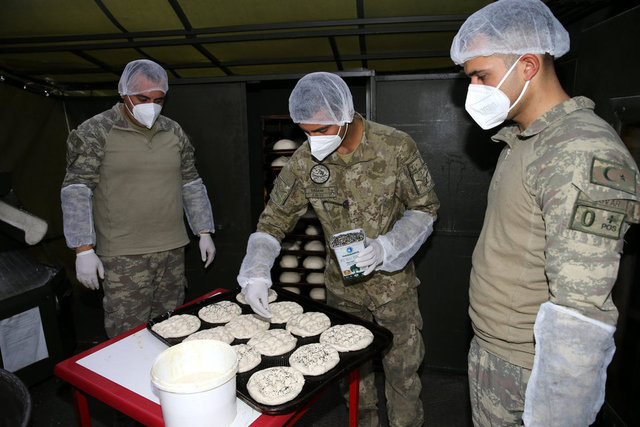 Mehmetçik, Dulkadiroğlu ilçesi Erkenez Mahallesi'ndeki çadır kentte kalan depremzedeler için ramazan pidesi hazırlıyor.