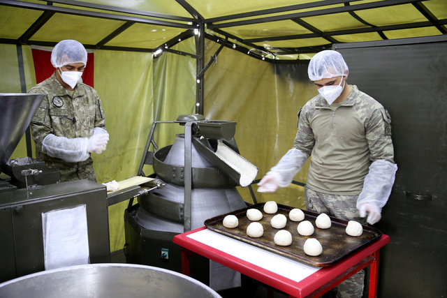 Kahramanmaraş'ın Dulkadiroğlu ilçesinde Denizli 11. Komando Tugay Komutanlığının kurduğu seyyar sahra fırınında komandolar depremzedeler için ekmek ve ramazan pidesi üretiyor.