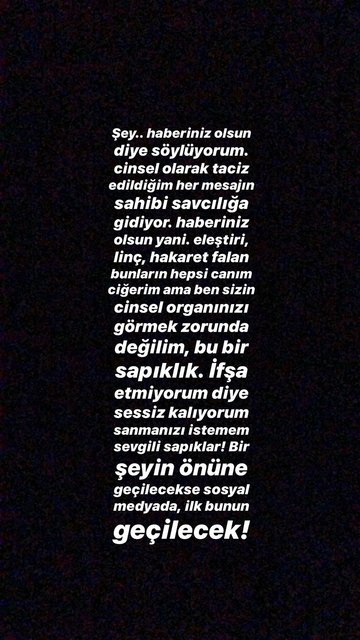 Şey... Haberiniz olsun diye söylüyorum. Cinsel olarak taciz edildiğim her mesajın sahibi savcılığa gidiyor. Haberiniz olsun yani. Eleştiri, linç, hakaret falan bunların hepsi canım, ciğerim ama ben sizin cinsel organınızı görmek zorunda değilim. Bu bir sapıklık. İfşa etmiyorum diye sessiz kalıyorum sanmanızı istemem sevgili sapıklar! Bir şeyin önüne geçilecekse sosyal medyada, ilk bunun geçilecek!