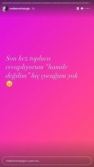 Oyuncu, hakkında çıkan haberlerin ardından konuyla ilgili açıklama yaptı. İddialara yanıt veren Meltem Miraloğlu, "Son kez topluca cevaplıyorum; hamile değilim, hiç çocuğum yok." açıklamasını yaptı.