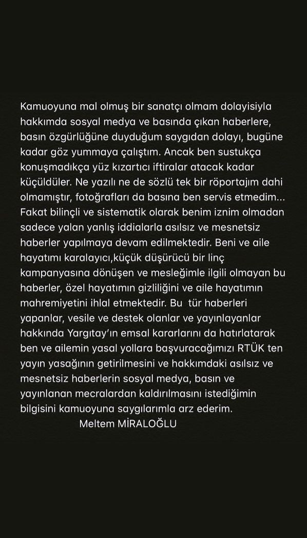 Bu tür haberleri yapanlar, vesile ve destek olanlar ve yayınlayanlar hakkında Yargıtay'ın emsal kararlarını da hatırlatarak ben ve ailemin yasal yollara başvuracağımızı, RTÜK'ten yayın yasağının getirilmesini ve hakkımdaki asılsız ve mesnetsiz haberlerin sosyal medya, basın ve yayınlayan mecralardan kaldırılmasını istediğimin bilgisini kamuoyuna saygılarımla arz ederim.