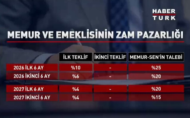 Memur-Sen, 2026'nın ilk altı ayı için yüzde 25, ikinci altı ayı için yüzde 20 zam talep etti. Sendikanın talebinde bu oranlar gelecek sene için yüzde 20 ve yüzde 15 olarak devam etti. Memur-Sen'in talebi 2026 için toplam yüzde 88, 2027 için yüzde 46 zam oldu.