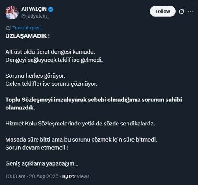 Konuya yönelik X hesabından açıklama yapan Memur-Sen Genel Başkanı Ali Yalçın ise "UZLAŞAMADIK ! Alt üst oldu ücret dengesi kamuda. Dengeyi sağlayacak teklif ise gelmedi. Sorunu herkes görüyor. Gelen teklifler ise sorunu çözmüyor. Toplu Sözleşmeyi imzalayarak sebebi olmadığımız sorunun sahibi olamazdık. Hizmet Kolu Sözleşmelerinde yetki de sözde sendikalarda. Masada süre bitti ama bu sorunu çözmek için süre bitmedi. Sorun devam etmemeli ! Geniş açıklama yapacağım…" ifadelerini kullandı.