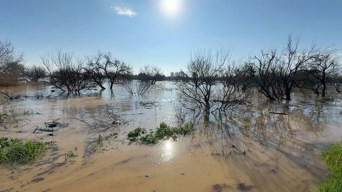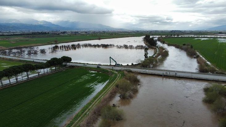 Aydın'da sağanakta debisi yükselen Büyük Menderes Nehri taştı; Koçarlı ilçesindeki tarım arazileri su altında kalırken, bölgede mahsur kalan bir çiftlik sahibi jandarmaya ait helikopterle kurtarıldı.