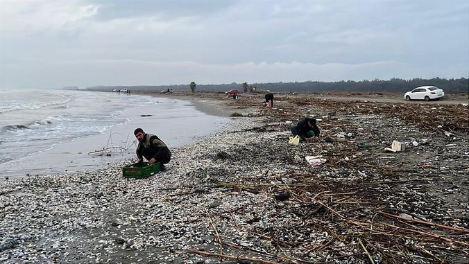 Mersin'de sel ve fırtına sonrası oluşan güçlü dalgalarla birlikte Adanalıoğlu sahiline binlerce kargı midyesi kıyıya vururken, balıkçılar midyeleri yem yapmak için topladı