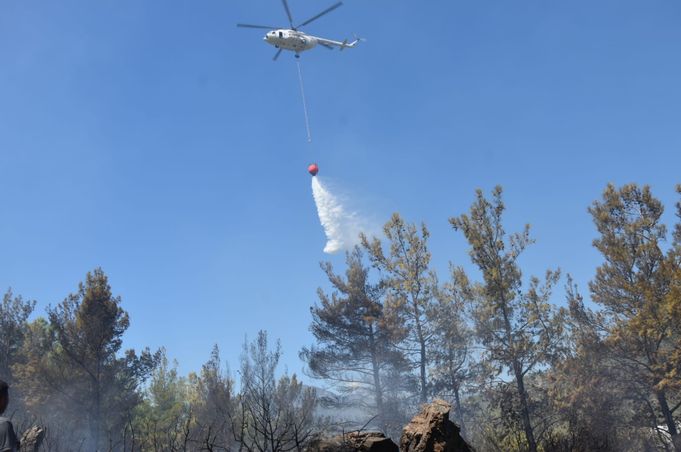 Yaklaşık 3 hektarlık alanda kızılçam ağaçlarının zarar gördüğü bölgede soğutma çalışmaları sürüyor.
