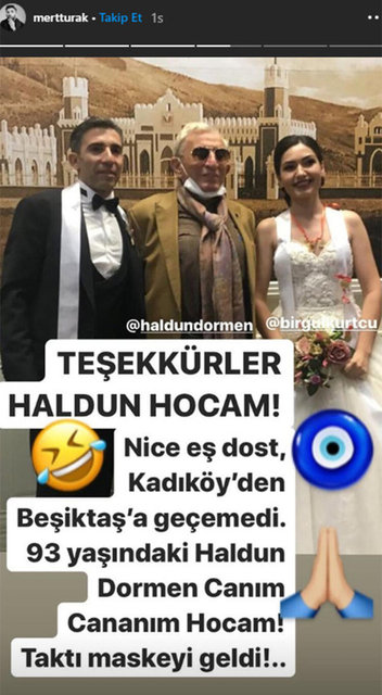 40 yaşındaki oyuncu, Instagram'ın hikaye bölümünden yaptığı paylaşıma, "Teşekkürler Haldun hocam. 90 yaşındaki Haldun Dorman, canım cananım hocam, taktı maskeyi geldi" notunu ekleyerek, usta sanatçıya teşekkür etti.