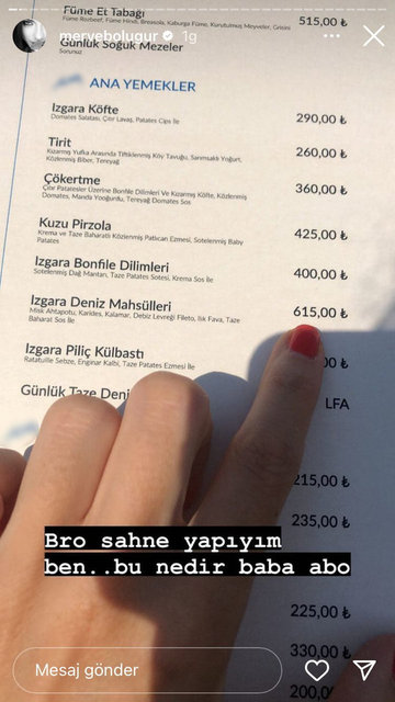 Menüde yer alan 615 TL'lik deniz mahsulleri tabağını gören Boluğur, tepkisini sosyal medya hesabı üzerinden gösterdi. Ünlü oyuncu, sosyal medyadan yayınladığı gönderisine, "Bro sahne yapayım ben... Bu nedir baba, abo!" ifadelerini not düştü.