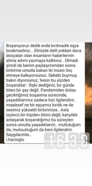 'Boşanıyoruz' dedik, evde kırılmadık eşya bırakmadınız. Elinizde delil yokken, dava dosyaları olan insanların haberlerinin altına adımı yazmaya kalktınız. Olmadı şimdi de benim paylaşımımdan sonra birbirine umutla bakan iki insanı linç etmeye kalkıyorsunuz.