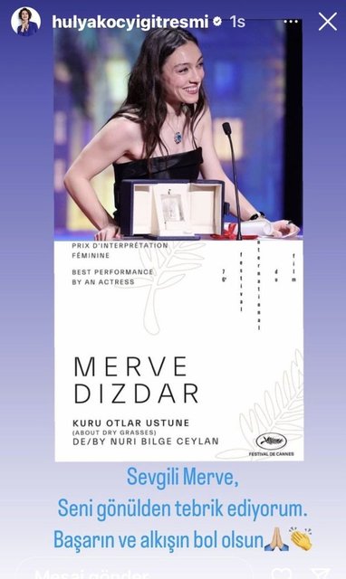 Cannes Film Festivali'nde rol aldığı 'Kuru Otlar Üstüne'deki rolüyle 'En İy Kadın Oyuncu' dalında ödüle layık görülen Merve Dizdar'a tebrik yağdı