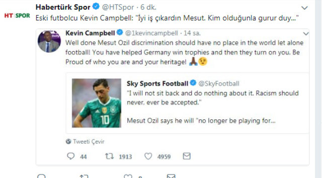 Haberde, tecrübeli futbolcunun Almanya Milli Takımı'nda oynamak istememesine gerekçe olarak kendisine yönelik ırkçılık ve saygısızlık yapılmasını gösterdiği belirtilerek, Mesut Özil'in özellikle DFB Başkanı Reinhard Grindel'i hedef aldığı ifade edildi.