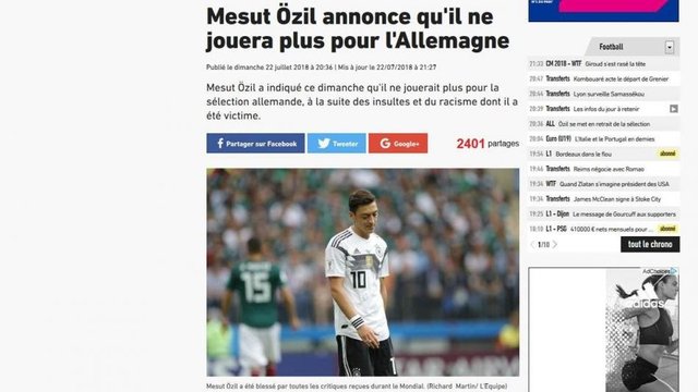 L'Equipe (Fransa): "Mesut Özil, ırkçılık nedeniyle Almanya Milli Takımı'nda oynamayacağını açıkladı."