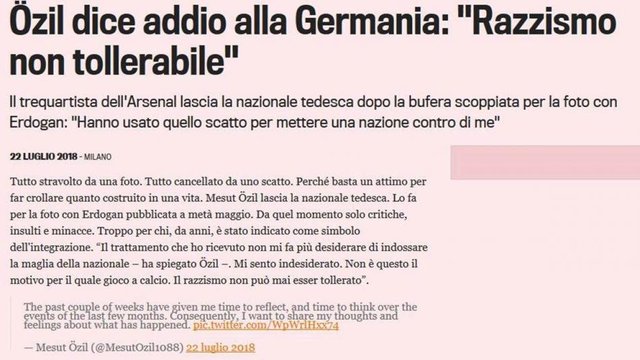 Gazzetta dello Sport (İtalya): "Özil, Almanya'ya veda etti: Irkçılık kabul edilemez! Arsenal'in yıldızı Erdoğan ile olan fotoğrafını açıkladı: "Bu fotoğrafı alet ederek bütün bir ülkeyi bana karşı kışkırttılar."