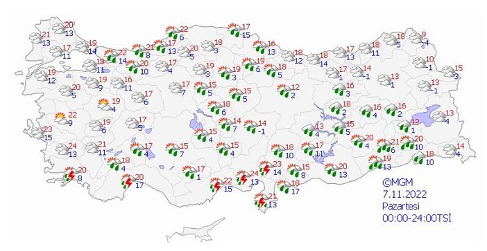 Antalya: 21, Parçalı ve çok bulutlu, sağanak ve gök gürültülü sağanak yağışlı.
