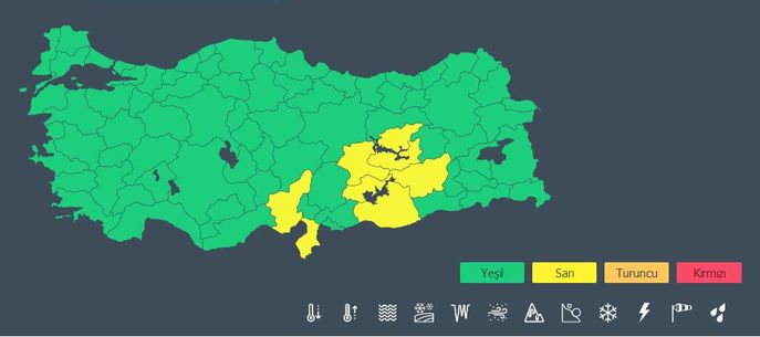 Meteoroloji'den yapılan son dakika uyarısına göre Adana, Hatay, Şanlıurfa, Adıyaman, Malatya, Diyarbakır, Elazığ ve Tunceli için "sarı" alarm verdi. Gök gürültülü sağanak yağışın akşam saatlerine kadar etkili olacağı bildirildi