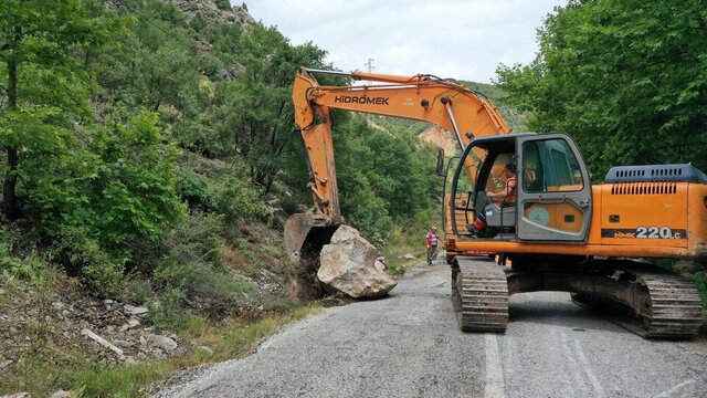 Kütahya'nın Tavşanlı ilçesinde, yamaçtan koparak kara yoluna düşen kaya parçaları nedeniyle ulaşım aksadı.