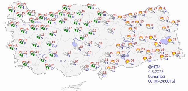İstanbul ve Kocaeli-Sakarya-Bolu çevresinde hafta sonu tıpkı bugün olduğu gibi biraz bulutlu, güneş aralardan görünüyor. Her iki günde de hava Trakya’da rüzgarlı ve lokal yağmurlu olacak, batıdaki lodos fırtınasına özellikle Pazar 12-18 arası dikkat etmekte yarar var. Çanakkale ve çevresi kuvvetli rüzgardan olumsuz etkilenebilir. Pazartesi Trakya’da hava sakinlerken Güney Ege’de kuvvetli rüzgarlı başlayacak görünüyor. Rüzgar diğer bölgelerde sakin-orta kuvvet arasında esecek. Ege denizi üzerinde fırtına 70-100km/saat hıza ulaşabilir.