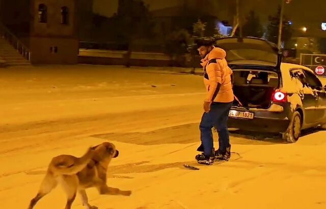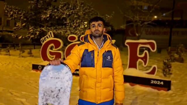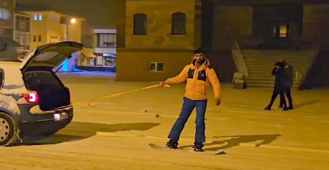 Yıllarca dağlarda kayak ve snowboard yapan Kömür, bu kez ilçedeki yolları pist gibi kullandı. Gece saatlerinde ilçe merkezinde arkadaşının otomobiline bağlanan ipi tutan Halil Kömür, trafiği tehlikeye düşürmeyecek şekilde snowboard yaptı.