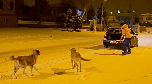 Hava sıcaklığının sıfırın altında 19 derece olduğu gecede Kömür'e zaman zaman sokak köpekleri de geldi.