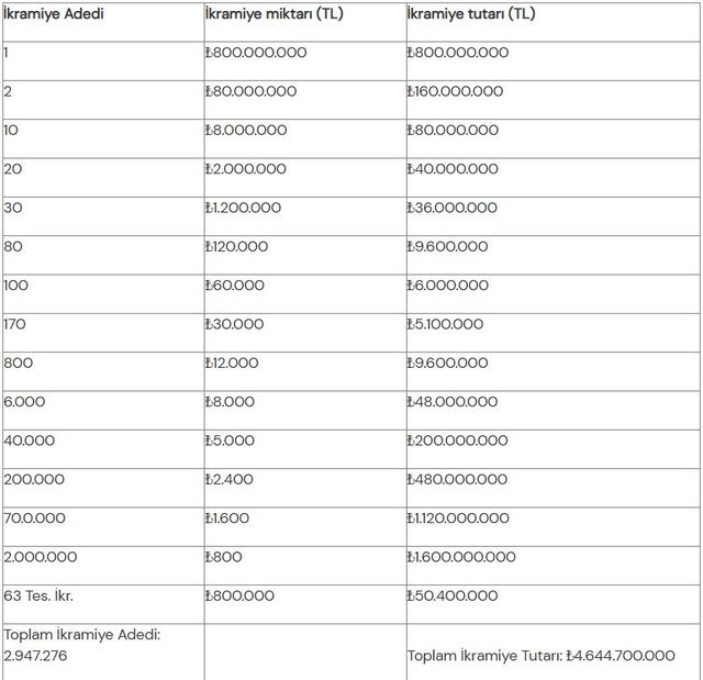 MİLLİ PİYANGO YILBAŞI İKRAMİYESİ TABLOSU