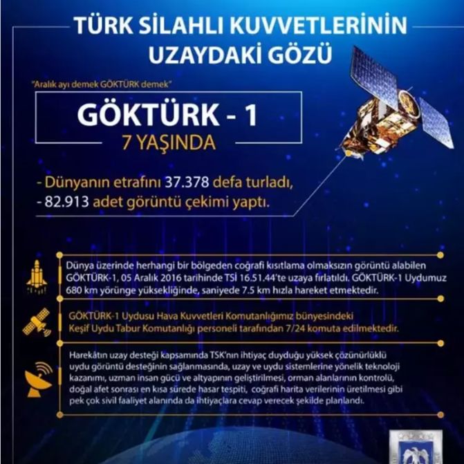 Türkiye’nin gözlem ihtiyaçlarını karşılayan uydulardan olan Göktürk-1 Uydusu 7 yaşında. Uydu, 5 Aralık 2016 yılında Fransız Guyanası'ndaki Koruou Fırlatma Merkezi'nden fırlatılarak göreve başlamıştı. Hava Kuvvetleri Komutanlığı bünyesindeki Keşif Uydu Tabur Komutanlığı personeli tarafından komuta edilen uydu, dünyanın etrafını 37 bin 378 defa turladı.
