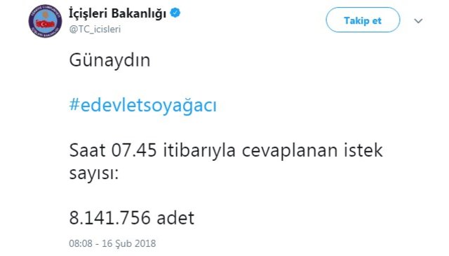 İçişleri Bakanlığı'nın Twitter hesabından yapılan paylaşımda, Saat 07.45 itibarıyla cevaplanan istek sayısının 8.141.756 adet olduğu belirtildi.