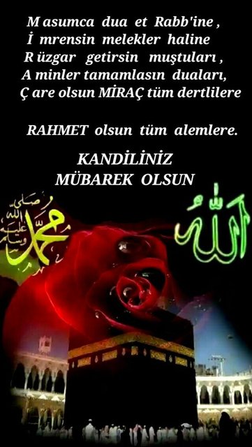 Rabbim Sen affedicisin affetmesini seven ve bilensin. Sen bizleri mübarek Miraç kandili hatırına Affı Mağfiret eyle. Amin! Hayırlı Kandiller.