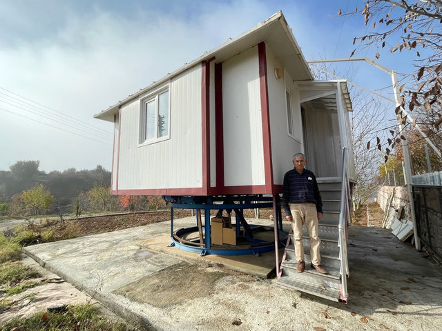 Muğla'nın Seydikemer ilçesinde yaşayan Ahmet Koca, motorlu ve raylı sistem üzerine yerleştirdiği 28 metrekarelik prefabrik evi 360 derece döndürebiliyor