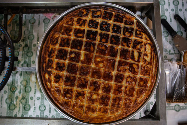 Bu sırada kenarda su kaynatın. Böreklik yufkayı kaynar suya sokup çıkardıktan sonra tepsinize yerleştirin. Yufkanızı yağlayıp üzerine peynirlerinizden azar azar yayın.Üzerine yeniden sıcak suda haşlanmış yufka yayın. Böreklik yufkalarınız ve peynirleriniz tükenene kadar bu işleme devam edin; en üst katman yufka olmalı. Baklavalık yufkaları yine en başta yaptığınız gibi aralarını yağlayarak tepsiye yerleştirin. Elinizle dikkatle bastırarak böreğin düzleşmesini sağlayın. En üstünü de bolca yağladığınız böreği kare kare dilimleyin. Tepsiyi ocağa alıp çevire çevire alt ve üst tarafını güzelce kızartın. Sıcak tüketmenizi öneririz. Afiyet olsun!