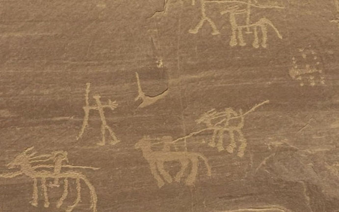Doğal kaya sığınağının tavanında, 10 bin yıl öncesinin izlerini taşıyan kırmızı pigmentli hayvan figürleri ve sembollerin yanı sıra, ilerleyen dönemlere ait Nabati dili ile Arapça kitabeler yer alıyor.