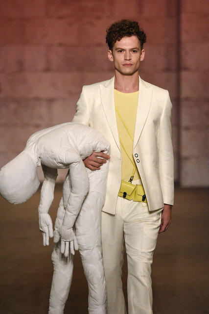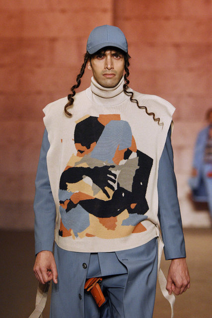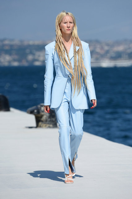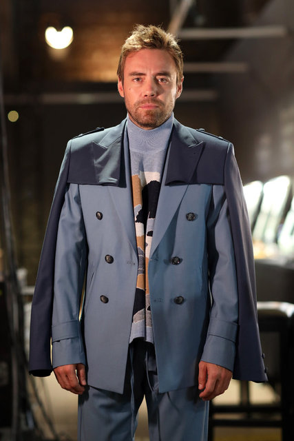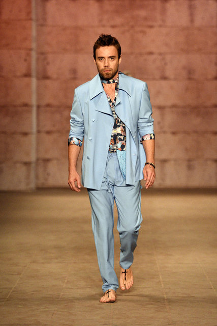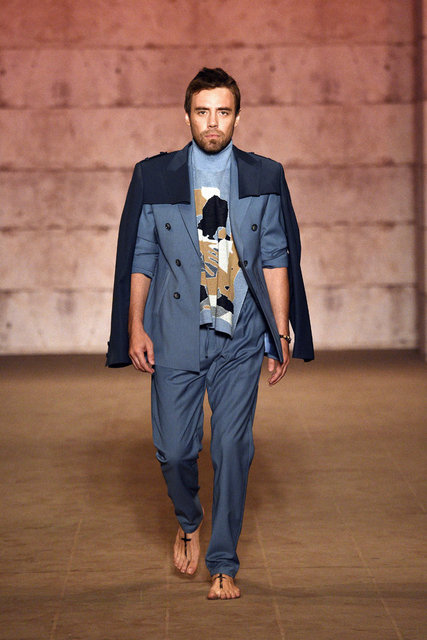 Emre Erdemoğlu defilesinde podyumda yürüyen Murat Dalkılıç, 70’lerden ilham alınarak hazırlanan koleksiyondan mavi tonlarında kısa kolu üzerine ikinci bir uzun kolu olan gök mavisi bir takım ile podyuma çıktı.