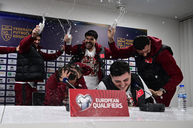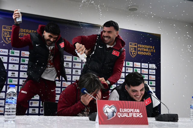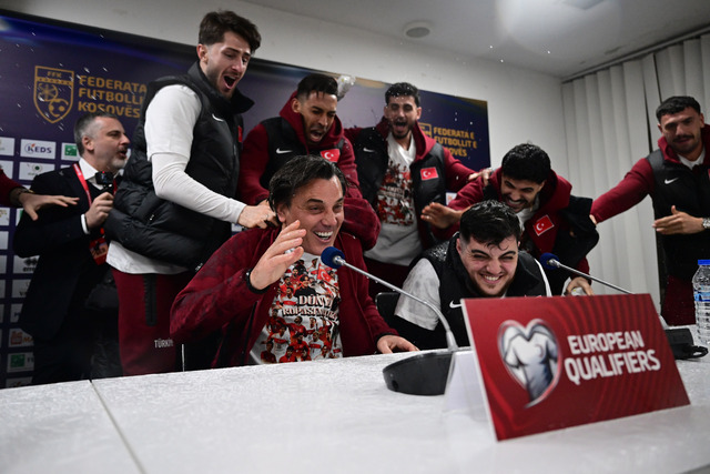 A Milli Futbol Takımı'nda futbolcular, Teknik Direktör Vincenzo Montella'nın basın toplantısına gelerek, burada şampiyonluğu beraber kutladı.