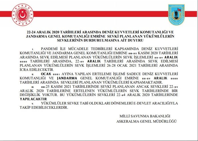 Milli Savunma Bakanlığı'nın yaptığı açıklamada; "Askerlik görevi için 23-25 Kasım tarihlerinde Deniz Kuvvetleri Komutanlığı ve Jandarma Genel Komutanlığı emrine sevk edilmesi planlanan yükümlülerin sevk işlemleri 22-24 Aralık 2020 tarihlerinde gerçekleştirilecektir. 22-24 Aralık tarihlerinde sevk edilmesi planlananların sevk işlemleri de 26-28 Ocak 2021'e ertelenmiştir. Erteleme sadece Deniz Kuvvetleri Komutanlığı ve Jandarma Genel Komutanlığı emrine sevki planlanan ve ilk planlamada 22-24 Aralık tarihlerinde sevk edileceği açıklananları kapsamaktadır. Kasım ayından Aralık'a ertelenenlerin sevk tarihinde bir değişiklik yoktur. 22-24 Aralık tarihlerinde sevk edileceği açıklanan yükümlüler sevk tarihlerini E-Devlet'ten takip edebilecek, duyuru metnine 'https://asal.msb.gov.tr' adresinden ulaşabilecektir" denildi.
