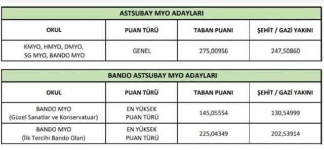 Kadın adaylar için Milli Savunma Üniversitesi hava, kara ve deniz harp okullarındaki taban puanlar ise şu şekilde:
