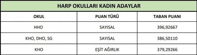 Milli Savunma Üniversitesi MSÜ Kara, Hava, Deniz Harp Okulu taban puanları (Kadın-Erkek)