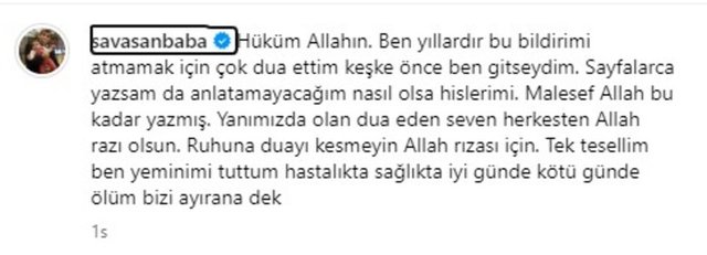 Hüküm Allahın. Ben yıllardır bu bildirimi atmamak için çok dua ettim keşke önce ben gitseydim. Sayfalarca yazsam da anlatamayacağım nasıl olsa hislerimi. Malesef Allah bu kadar yazmış. Yanımızda olan dua eden seven herkesten Allah razı olsun. Ruhuna duayı kesmeyin Allah rızası için. Tek tesellim ben yeminimi tuttum hastalıkta sağlıkta iyi günde kötü günde ölüm bizi ayırana dek.