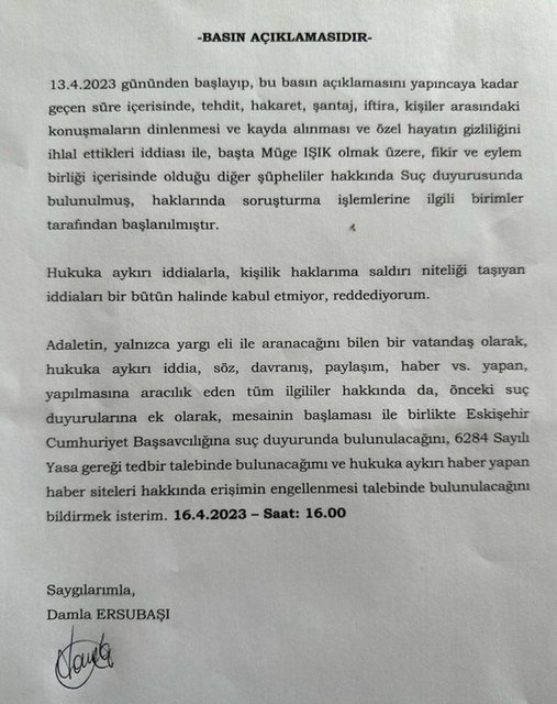 Elindeki tüm kanıt ve evraklar ile şikayetçi olduğunu, sürecin artık mahkemede devam edeceğini belirten Ersubaşı, “Bütün şikayetlerimizi yaptık. Davalarımız açıldı. Bendeki bütün deliller de mahkemede. Kimin delili varsa göstersin, ben hepsini sundum. Kimse kendini benimle temizlemesin. Kendi aile sorunları beni ilgilendirmiyor. Benim dostum, arkadaşım dediğim insan. Ama kendi çamurunu kimse benimle temizlemesin. Bence bunu söylemem çok yeterli olacaktır. Detaya giremiyorum. Her şey zaten mahkemede. Konuşmam ne gerekirse hepsini ben delilli zaten söylerim. Ama delillerimin hepsini sundum. Varsa insanların elinde bir delil onlar da sunsunlar. Kimse benim üstümden yürümesin. Ben bugüne kadar ne çocuklarıma, ne kendime, ne anneme babama, aileme yakışmayacak hiçbir davranışta bulunmuş bir kadın değilim. Yapılan şey tamamen kadının kadına yaptığı bir şiddet ve gerçekten burada da yine görüyoruz kadının en büyük düşmanı kadın. 18 yaşımdan beri ben kendi paramı çalışıp kazanan bir insanım. Kimse bana iftira atmasın. Atıyorsa da ispatlasın. Ben ispatladım mesela. Bana atılan iftiraların hepsini herkes ispatlasın. Seni öldüreceğim, şu kadar saatin var gibi tehditler aldım. Bunların hepsi delilli bir şekilde zaten sunuldu. Herkes de gördü. Şu saatten sonra da kimse beni arayıp da geri çekelim davayı, uzlaşalım gibi bir şey lütfen söylemesin. Çünkü ben 3 gün boyunca yaşadığım psikolojik şiddeti ben bilirim ve benim çocuklarım bilir” ifadelerini kullandı.