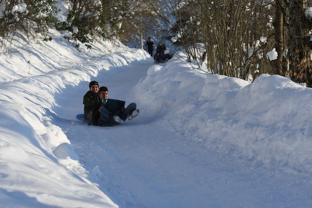 Ormanlık alanda kalan yaklaşık 150 metre uzunluğundaki patika yolu traktörüyle düzleştiren ve yan kısımlarına da güvenlik için set oluşturan Çiçek'in hazırladığı piste aileleriyle gelen çocuklar, muşamba, poşet ve tahta parçalarıyla kayarak karın keyfini çıkarıyor.
