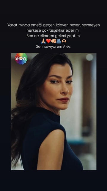 Ünlü oyuncu, dizinin bir bölümünden kesit niteliğindeki fotoğrafı sosyal medya hesabında paylaşarak; "Yaratımında emeği geçen, izleyen, seven, sevmeyen herkese teşekkür ederim. Ben de elimden geleni yaptım. Seni seviyorum Alev." şeklinde ifadelerde bulundu.